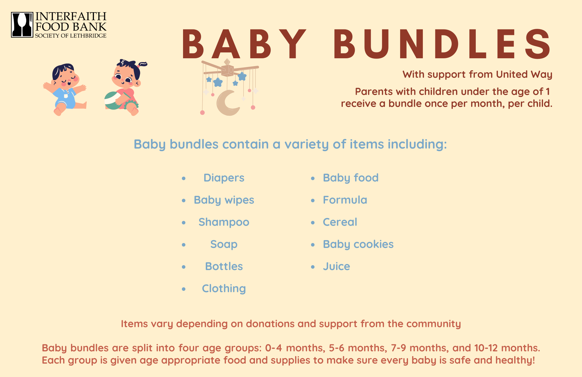 These bundles include baby cereal and food, something soft & other necessities. Baby Bundles are given once monthly until the child’s first birthday. Things like diapers, formula, etc. are also available upon request. What goes in our Baby Bundles?
